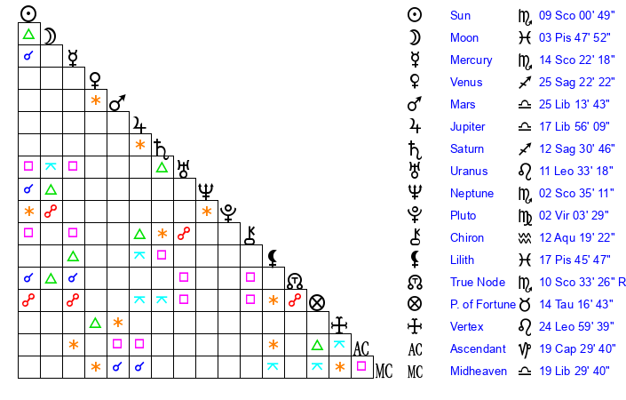 | Neptune | 2 Scorpio 35 | 29 Pisces 46 | 4 Scorpio 33 |