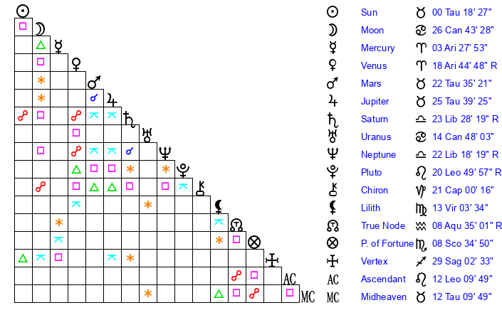 | Sun | 0 Taurus 18 | 0 Taurus 52 | 9 Cancer 32 |