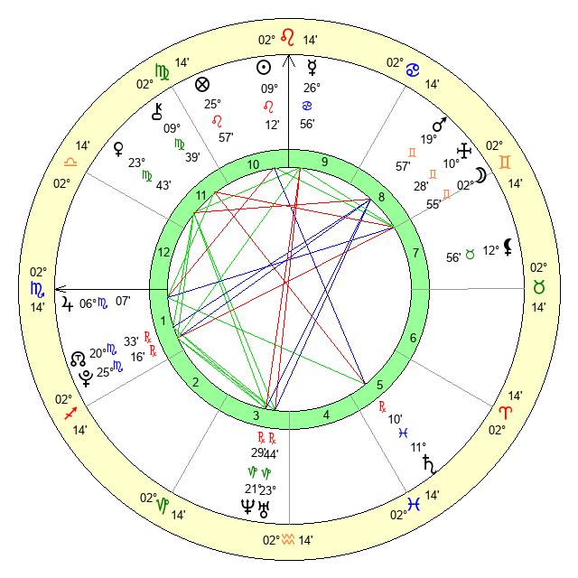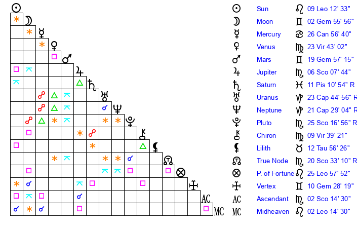 Moon | 2 Gemini 53 | 11 Scorpio 41 | 17 Cancer 40 |