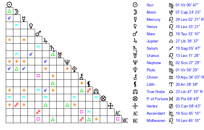 | Moon | 7 Capricorn 22 | 18 Virgo 54 | 10 Gemini 8 |