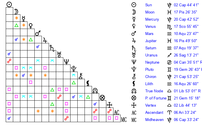 | Pluto | 19 Gemini 27 | 2 Aquarius 32 | 19 Gemini 11 |