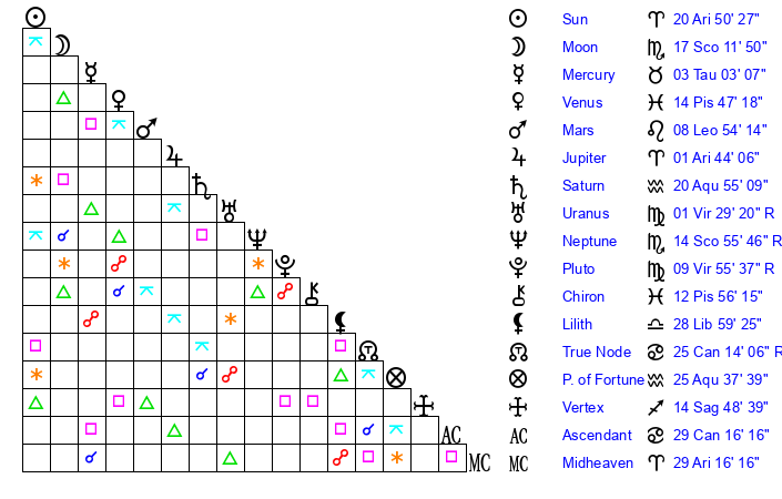 | Neptune | 14 Scorpio 55 | 0 Aries 26 | 13 Scorpio 20 |