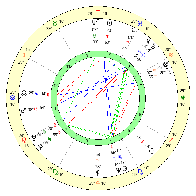 | Mars | 8 Leo 54 | 27 Cancer 19 | 4 Virgo 42 |