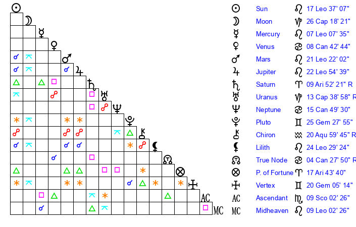 | Sun | 17 Leo 37 | 18 Leo 19 | 13 Sagittarius 12 |