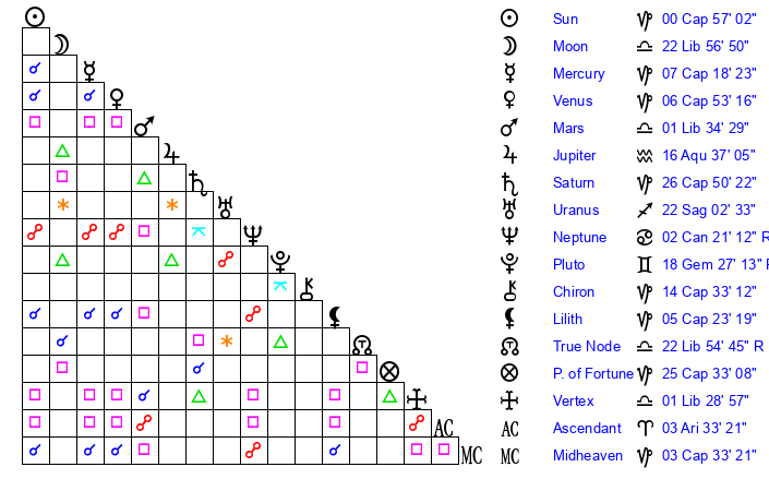 | Moon | 22 Libra 55 | 13 Aquarius 6 | 10 Aries 53 |