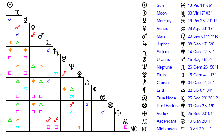 | Moon | 3 Virgo 11 | 14 Taurus 44 | 8 Pisces 52 |