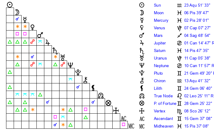 | Sun | 23 Aquarius 52 | 25 Aquarius 15 | 19 Gemini 36 |
