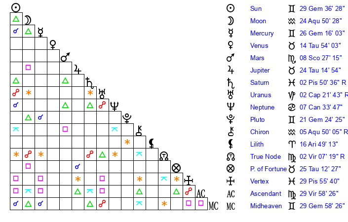 | Pluto | 21 Gemini 25 | 3 Aquarius 19 | 22 Gemini 37 |