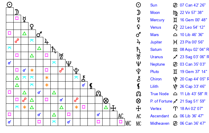 | Sun | 7 Cancer 42 | 9 Cancer 9 | 6 Scorpio 6 |