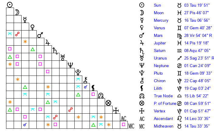 | Moon | 27 Pisces 44 | 21 Pisces 16 | 26 Virgo 20 |