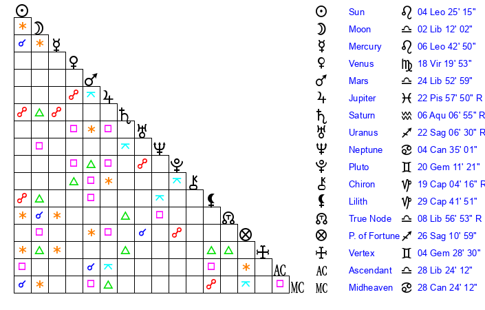 | Sun | 4 Leo 25 | 5 Leo 52 | 4 Sagittarius 17 |