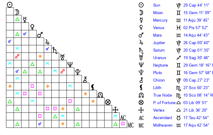| Sun | 29 Capricorn 44 | 0 Aquarius 53 | 1 Gemini 36 |