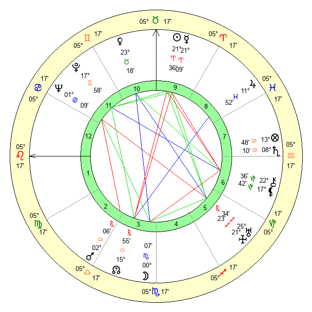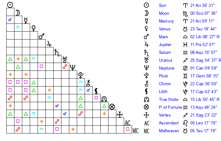 | Sun | 21 Aries 36 | 23 Aries 2 | 18 Leo 47 |
