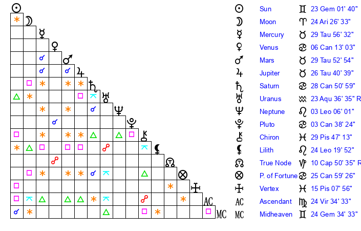 | Sun | 23 Gemini 1 | 23 Gemini 53 | 6 Libra 57 |