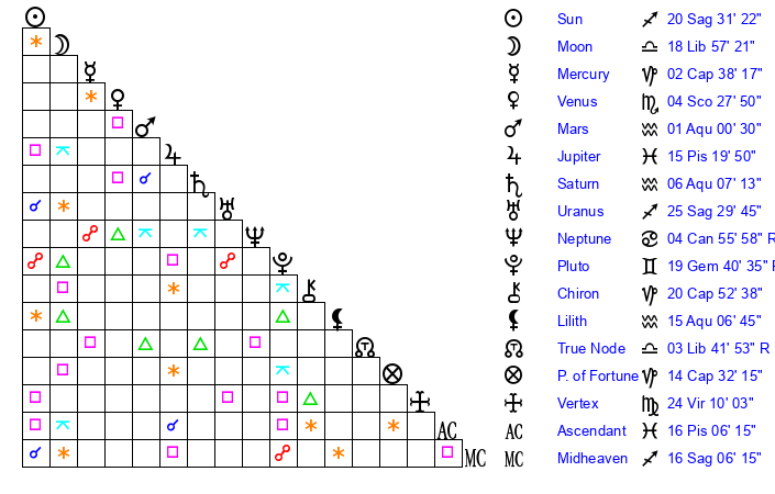 | Moon | 18 Libra 53 | 12 Libra 36 | 28 Pisces 27 |