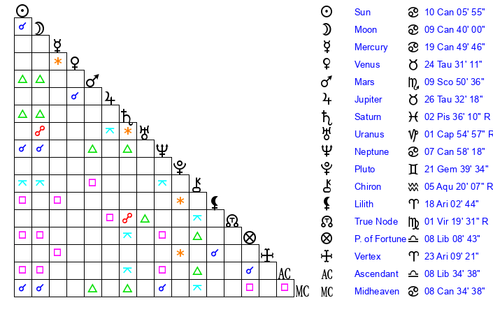 | Neptune | 7 Cancer 59 | 2 Aries 10 | 10 Cancer 21 |