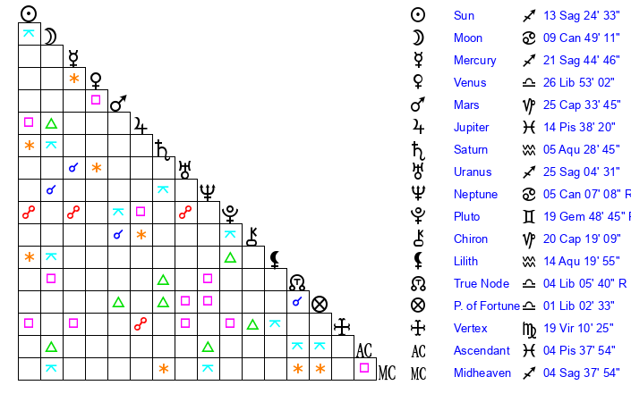 | Sun | 13 Sagittarius 25 | 14 Sagittarius 49 | 16 Aries 28 |