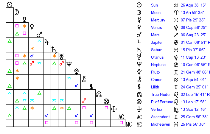 | Sun | 26 Aquarius 38 | 28 Aquarius 1 | 22 Gemini 14 |