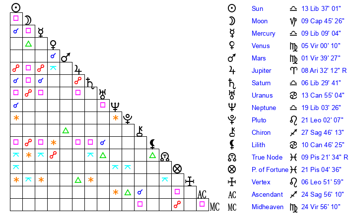 | Saturn | 6 Libra 58 | 27 Pisces 9 | 14 Libra 24 |