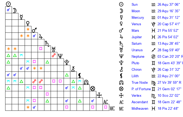 | Sun | 26 Aquarius 37 | 28 Aquarius 16 | 25 Gemini 4 |