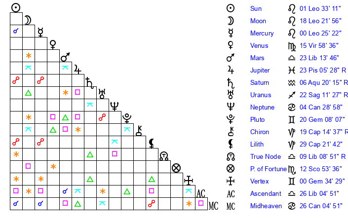 | Sun | 1 Leo 33 | 3 Leo 0 | 1 Sagittarius 15 |