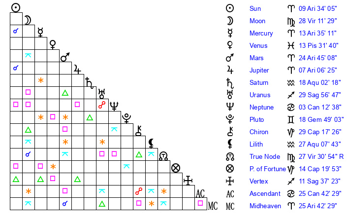 | Moon | 28 Virgo 20 | 27 Aries 55 | 1 Pisces 28 |