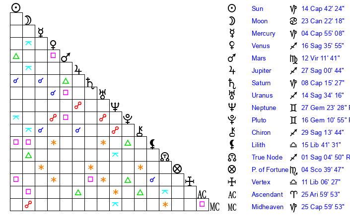 | Uranus | 14 Sagittarius 32 | 27 Taurus 50 | 15 Sagittarius 54 |