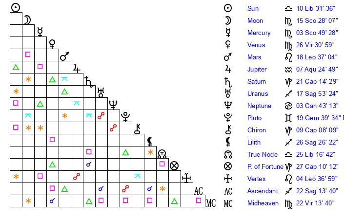 | Sun | 10 Libra 31 | 11 Libra 43 | 14 Aquarius 43 |
