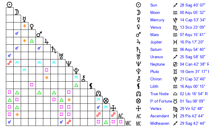| Moon | 0 Aquarius 7 | 18 Capricorn 21 | 11 Cancer 51 |