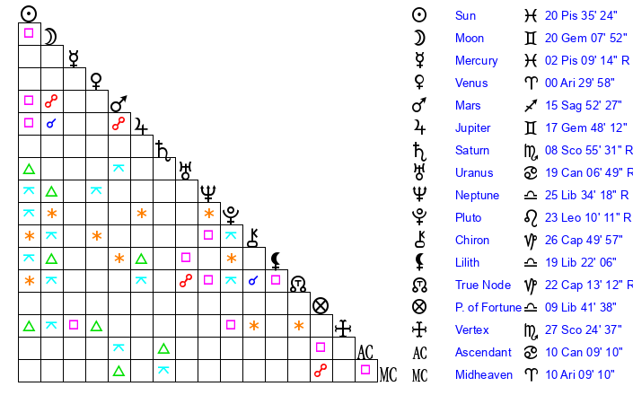 | Saturn | 9 Scorpio 27 | 21 Pisces 56 | 4 Scorpio 48 |