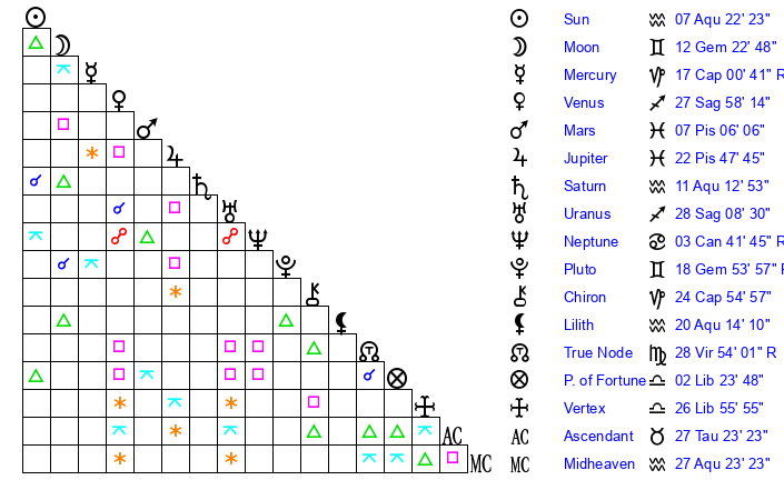 | Sun | 7 Aquarius 22 | 9 Aquarius 2 | 6 Gemini 54 |