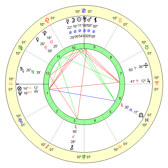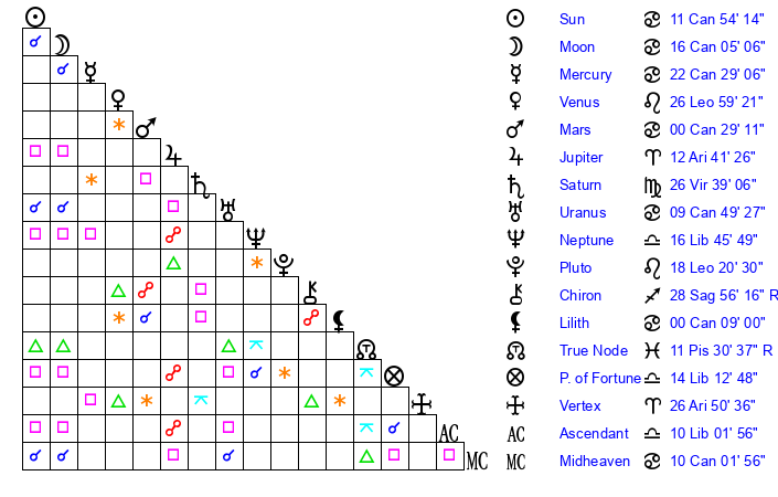 | Moon | 16 Cancer 8 | 3 Scorpio 40 | 8 Aries 1 |