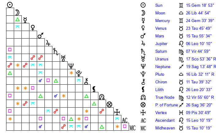 | Moon | 26 Libra 39 | 24 Libra 23 | 12 Cancer 54 |