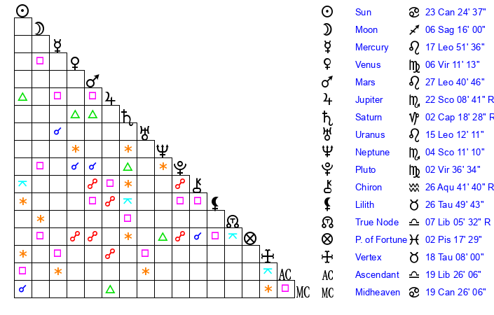 | Uranus | 15 Leo 14 | 0 Gemini 25 | 19 Leo 10 |