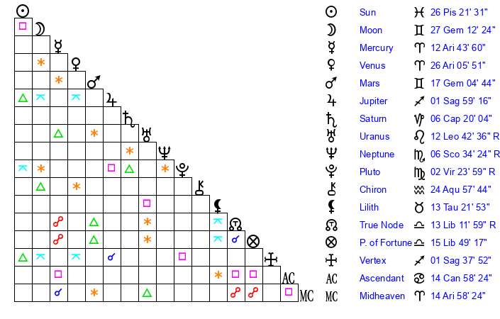 | Sun | 26 Pisces 21 | 27 Pisces 21 | 0 Gemini 51 |