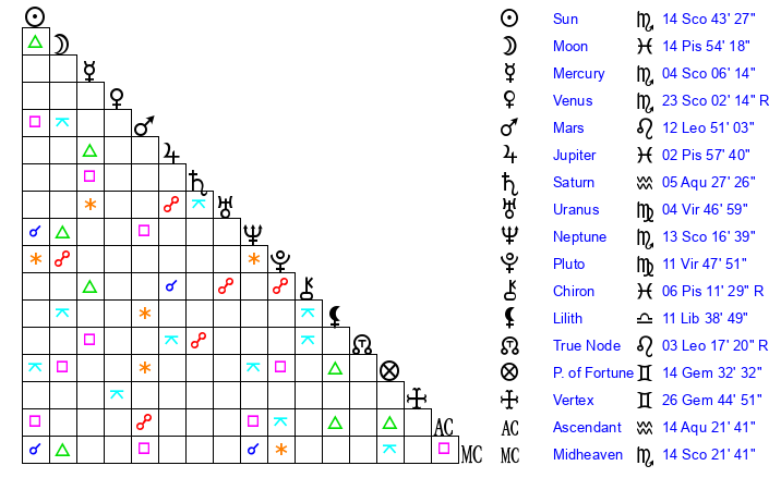| Neptune | 13 Scorpio 16 | 27 Pisces 22 | 15 Scorpio 14 |