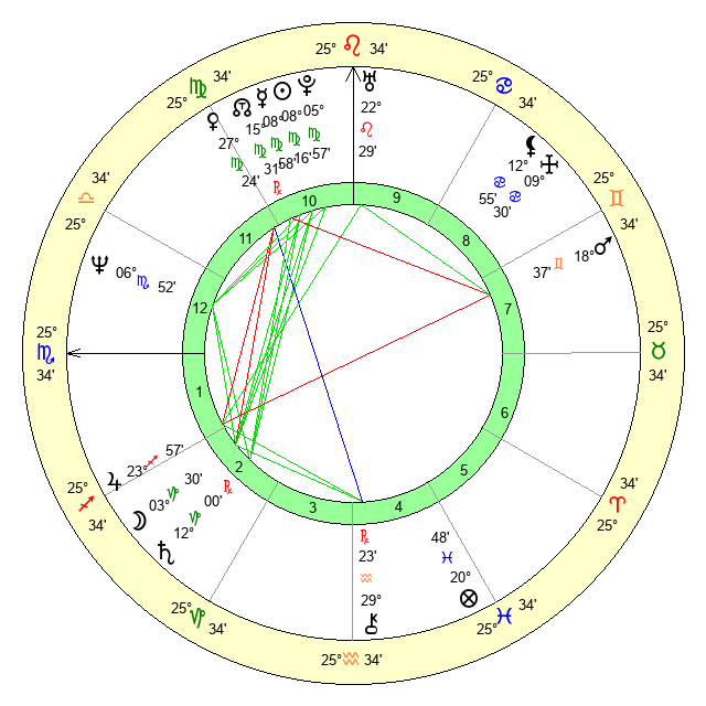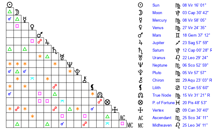 | Sun | 8 Virgo 16 | 8 Virgo 32 | 12 Scorpio 17 |