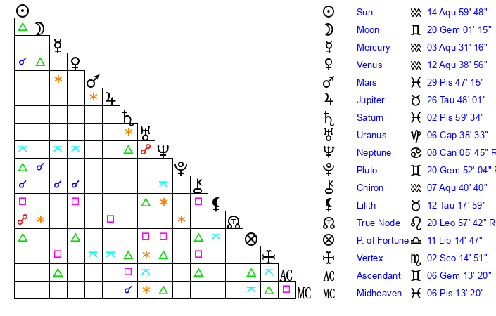 | Sun | 15 Aquarius 0 | 16 Aquarius 8 | 12 Gemini 11 |