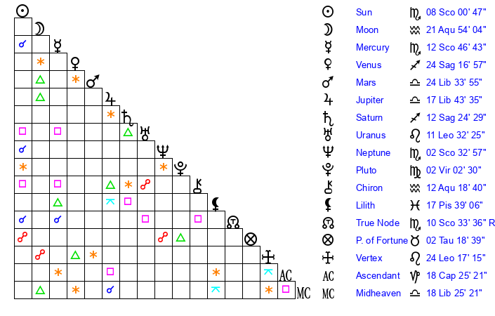 | Sun | 8 Scorpio 0 | 8 Scorpio 31 | 16 Capricorn 54 |