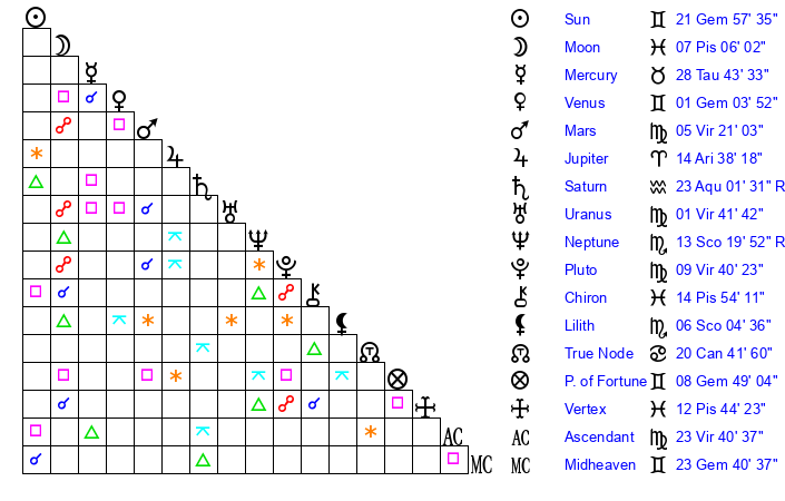 | Moon | 7 Pisces 2 | 20 Capricorn 30 | 23 Gemini 7 |