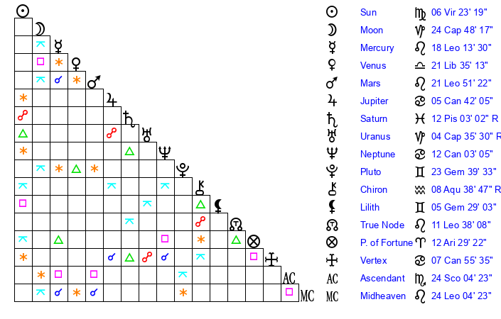 | Mercury | 18 Leo 14 | 24 Leo 39 | 15 Sagittarius 18 |
