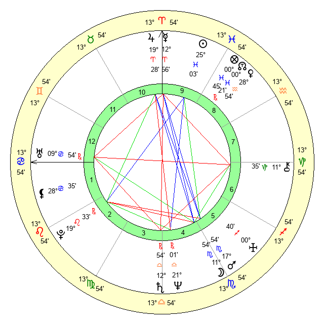 | Moon | 11 Scorpio 56 | 10 Libra 51 | 20 Cancer 33 |