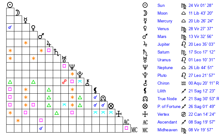 | Sun | 24 Virgo 1 | 25 Virgo 3 | 3 Sagittarius 39 |