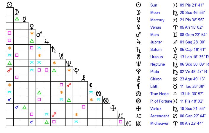 | Moon | 20 Scorpio 42 | 19 Pisces 32 | 21 Aries 9 |