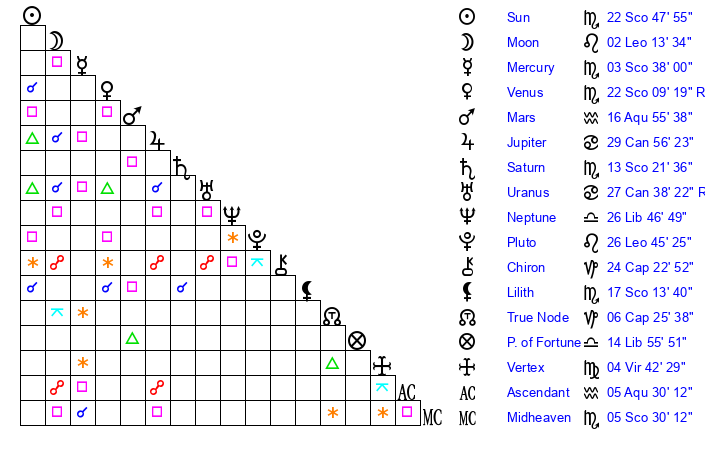 | Venus | 22 Scorpio 9 | 10 Scorpio 59 | 18 Sagittarius 7 |