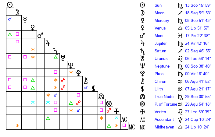 | Sun | 13 Scorpio 15 | 13 Scorpio 32 | 23 Capricorn 16 |
