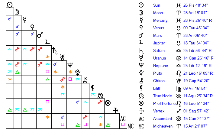 | Neptune | 23 Libra 12 | 29 Pisces 31 | 21 Libra 25 |