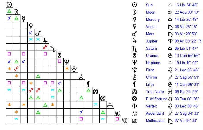 | Moon | 21 Aquarius 58 | 7 Gemini 2 | 26 Libra 13 |