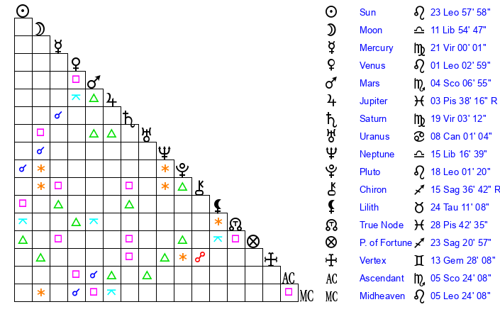 | Sun | 23 Leo 58 | 24 Leo 48 | 7 Scorpio 27 |