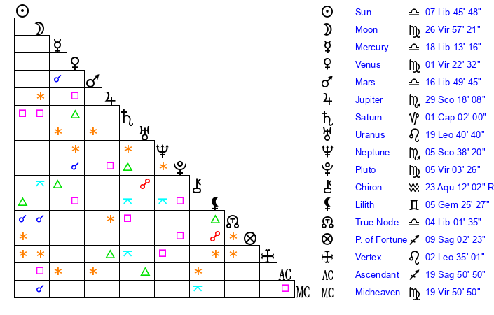 | Moon | 26 Virgo 56 | 28 Capricorn 27 | 9 Pisces 14 |